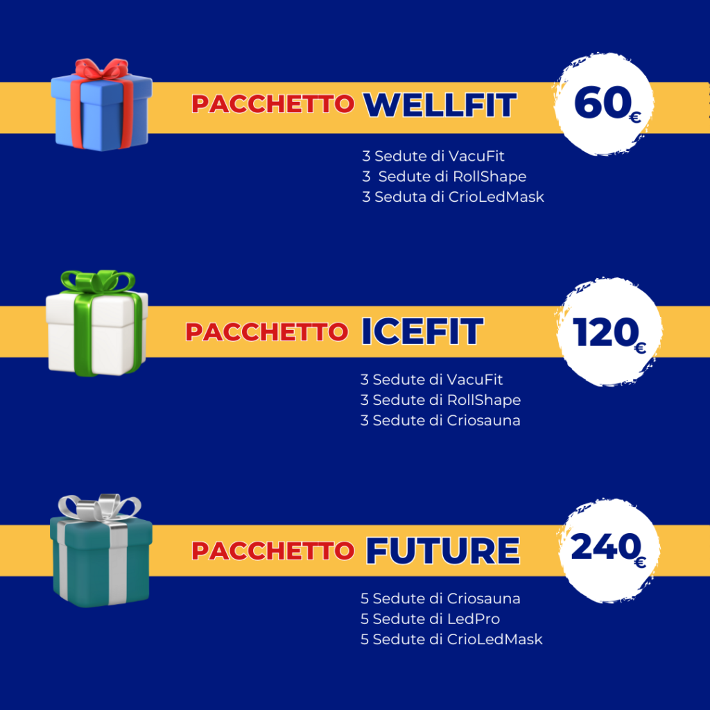 Il pacchetto ICEFIT è altrettanto bello e conveniente: 3 sedute di VacuFit, 3 sedute di RollShape e 3 sedute di Criosauna. Il prezzo è altrettanto clamoroso: solamente 120€!!!