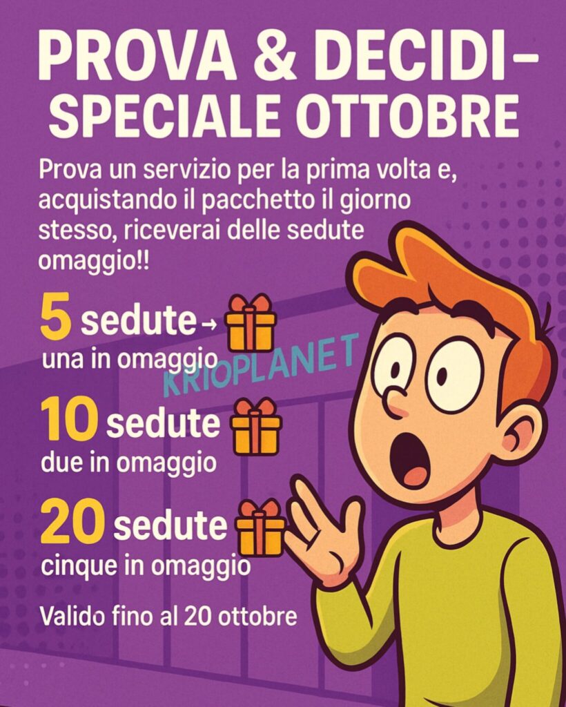 Ottobre è il mese giusto per rimettersi in moto 💪. Dopo l’estate e i mille impegni di settembre, tanti pensano: “Ora tocca a me”. Ecco perché da Krio abbiamo pensato a una promo dedicata a chi vuole provare per la prima volta i nostri servizi e scoprire tutti i benefici già dalla prima seduta.